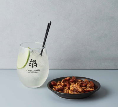 ラムネに似た⾵味のある“CHILL GREEN spicy &citrus” をライムとソーダでさっぱりとした爽やかな1杯に。⽢味と酸味、ほろ苦さのバランスのよさを堪能して。