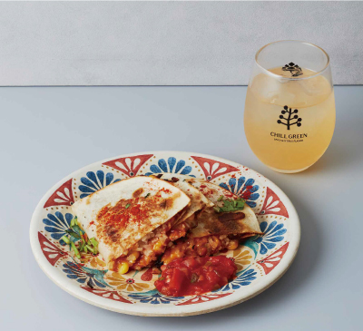 オレンジやコーラ、スパイスでマリネした豚肉と、濃厚なチェダーチーズなどと一緒にトルティーヤに包んで焼いたケサディーヤ。ライムの効いたドリンクとともに。