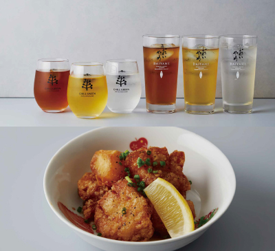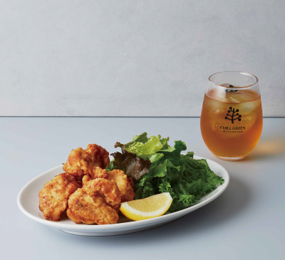 アーモンドミルクに漬け込み醤油ベースで味付けした唐揚げは、ミルキーな風味と外はカリッ、中の鶏肉はジューシー。ほのかな甘みと香ばしい「なた豆茶」割りと好相性。