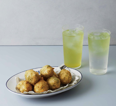 弾力がありプリッとした歯ごたえ、たこ独特の旨味と香ばしい衣の三位一体の人気のたこの唐揚げ。揚げ物のおいしさを引き立てるシンプルなソーダ割りの焼酎と召し上がれ。