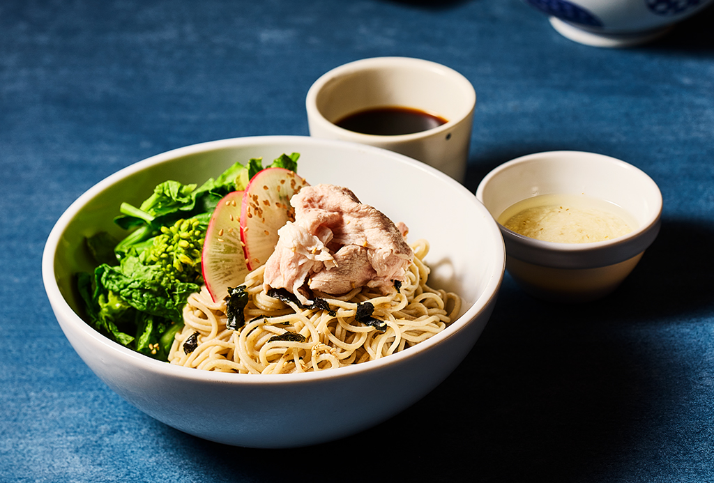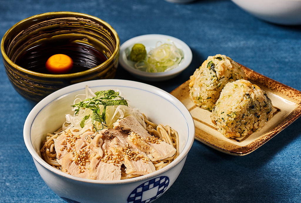 Chilled Tsukimi Soba with Carefully Selected Egg, Sobakichi’s Signature Kaeshi Sauce, and a “Tanuki Onigiri” made with MUS MUS Specially Selected Rice