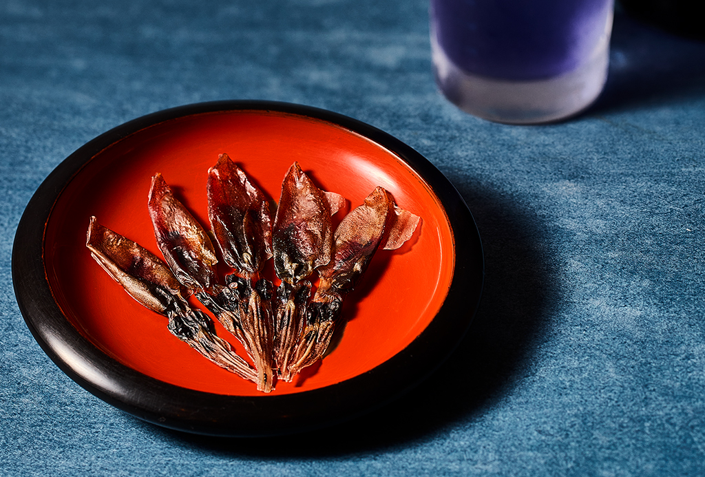 MOHEJIがおすすめとして紹介する、築地魚河岸の老舗・尾粂商店のホタルイカ干し。明治四年創業の尾粂商店が取り扱う旨みたっぷりのホタルイカの干物を、来夢来人自慢のお酒とともに楽しめる一皿として提供します。噛むほどに広がる濃厚な海の味わいは、お酒との相性も抜群。ついつい杯が進んでしまう、大人の味わいです。
