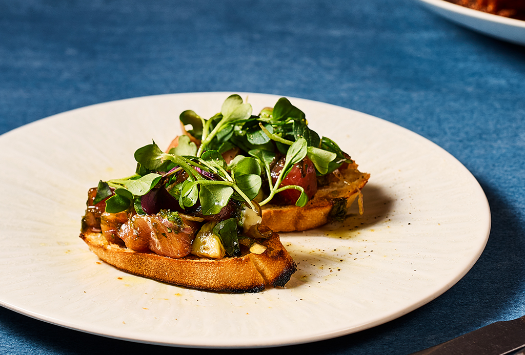 An anniversary-exclusive dish.Inspired by the Hawaiian classic poke, bluefin tuna and avocado are reinterpreted as a Spanish-style pincho, in the spirit of RIGOLETTO. The rich flavor of tuna and the creamy depth of avocado come together in a satisfying bite-sized dish. A playful creation where Hawaiian and Spanish influences meet.