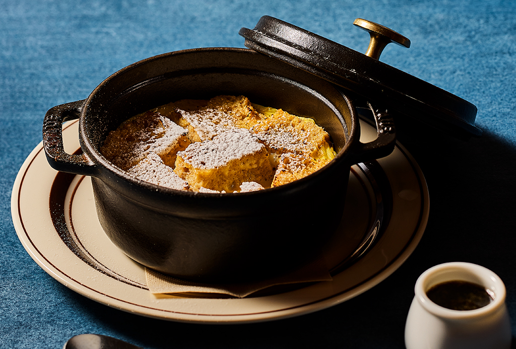 やさしい甘さのデザートメニュー。沢村の自家製熟成酵母で焼き上げたパンに、ニューみるくの看板「みるく」を合わせ、しっとりとしたパンプディングに仕上げました。別添えの自家製カラメルソースをかければ、コクのある甘さがさらに引き立ちます。焼き立てならではの香ばしさとともに楽しめる、周年の特別なデザートです。